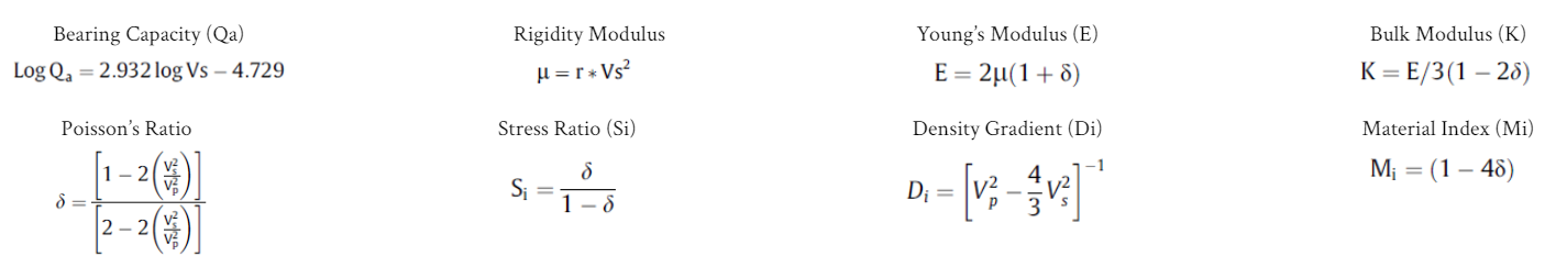 Compressional and shear wave velocities are estimated from the first breaks of the refracted seismic waves using time lapse hodographs and interactive inversion programs. Seismic velocity is a function of density, porosity, mineral composition, and the degree of cementation and consolidation, fracturing and weathering. The physical properties of soils and rocks are estimated with seismic refraction for geological, geotechnical and construction suitability assessment. The elastic moduli (Poisson’s ratio, bulk’s modulus, rigidity modulus and Young’s modulus), competence scales (material index, concentration index and stress ratio, and density gradient) and soil bearing capacity are key parameters for geotechnical investigations. Elastic and mechanical parameters are used for estimating the deformation in soil and rocks supporting large infrastructure foundations such as bridges, tunnels and buildings.