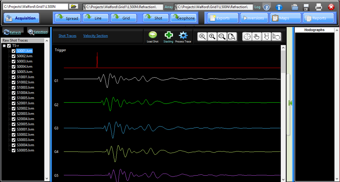 For a proper design of the seismic data acquisition the geophysicist should have knowledge of the expected bedrock depth, the thickness of the stratigraphic layers and the overburden extent over the survey area. This will dictate the length of the geophone spread to be used for mapping the layers of interest, the spacing between the geophones, the expected time of the arrival of the seismic wave at each geophone and the locations, magnitude and number of energy sources and offsets. The first step in processing/interpreting refraction seismic data is to pick the arrival times of the seismic signal. A plot is then made showing the arrival times against distance between the shot and geophone, called a time-distance graph. The time distance plot shows the waves arriving at the geophones directly from the shot and the refracted waves that arrive ahead of the direct waves. The refracted waves have traveled a sufficient distance along the higher speed refractor (bedrock) to overtake the direct wave arrivals. One of the most common methods of refraction interpretation is Generalized Reciprocal Method (GRM). Two-dimensional section results are derived from this technique, where the rock and soil velocities are estimated for each layer.